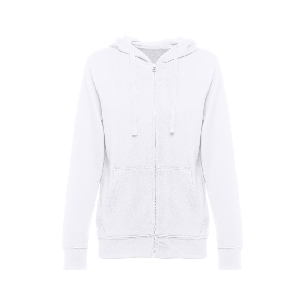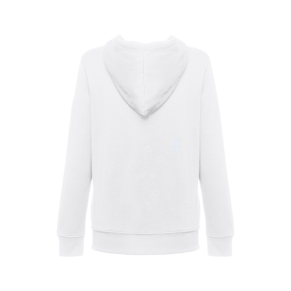 50% cotton and 50% polyester women’s sweatshirt (320 g/m²) with carded interior. The hood is lined and contains colour cord closure. The front area has two marsupial pockets with plastic cover closure. Piece with cuffs and ribbon waistband. Sizes: S, M, L, XL, XXL