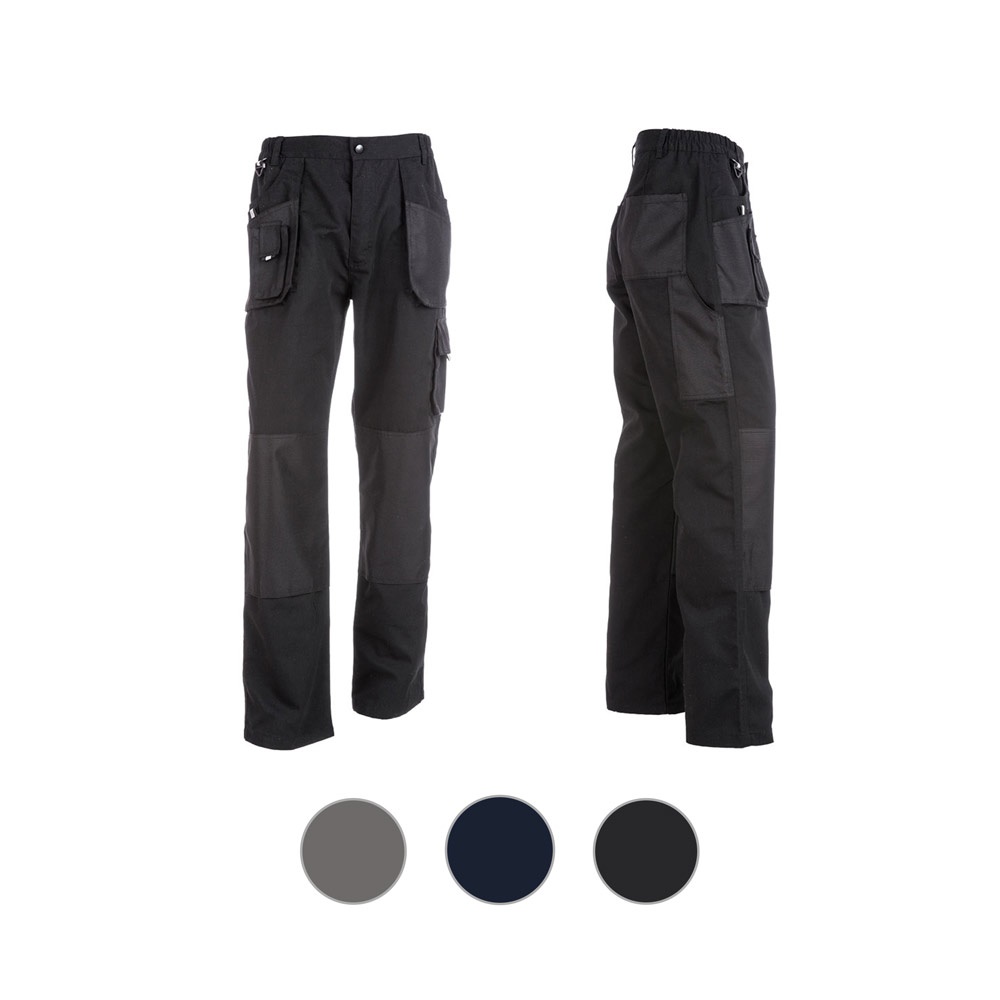 Men’s trousers in 98% cotton and 2% elastane (240 g/mยฒ). Contains 6 pockets: 2 side pockets with zip closure, 2 front pockets and 2 back pockets. Waist with elastic on the sides. Sizes: XS, S, M, L, XL, XXL